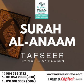 Tafseer of Sura Al-Anaam - Presented by Mufti A.K. Hoosen, a globally respected scholar known for his deep insight, authentic scholarship, and clear presentation, this Tafseer brings together classical explanations with practical guidance for the modern believer